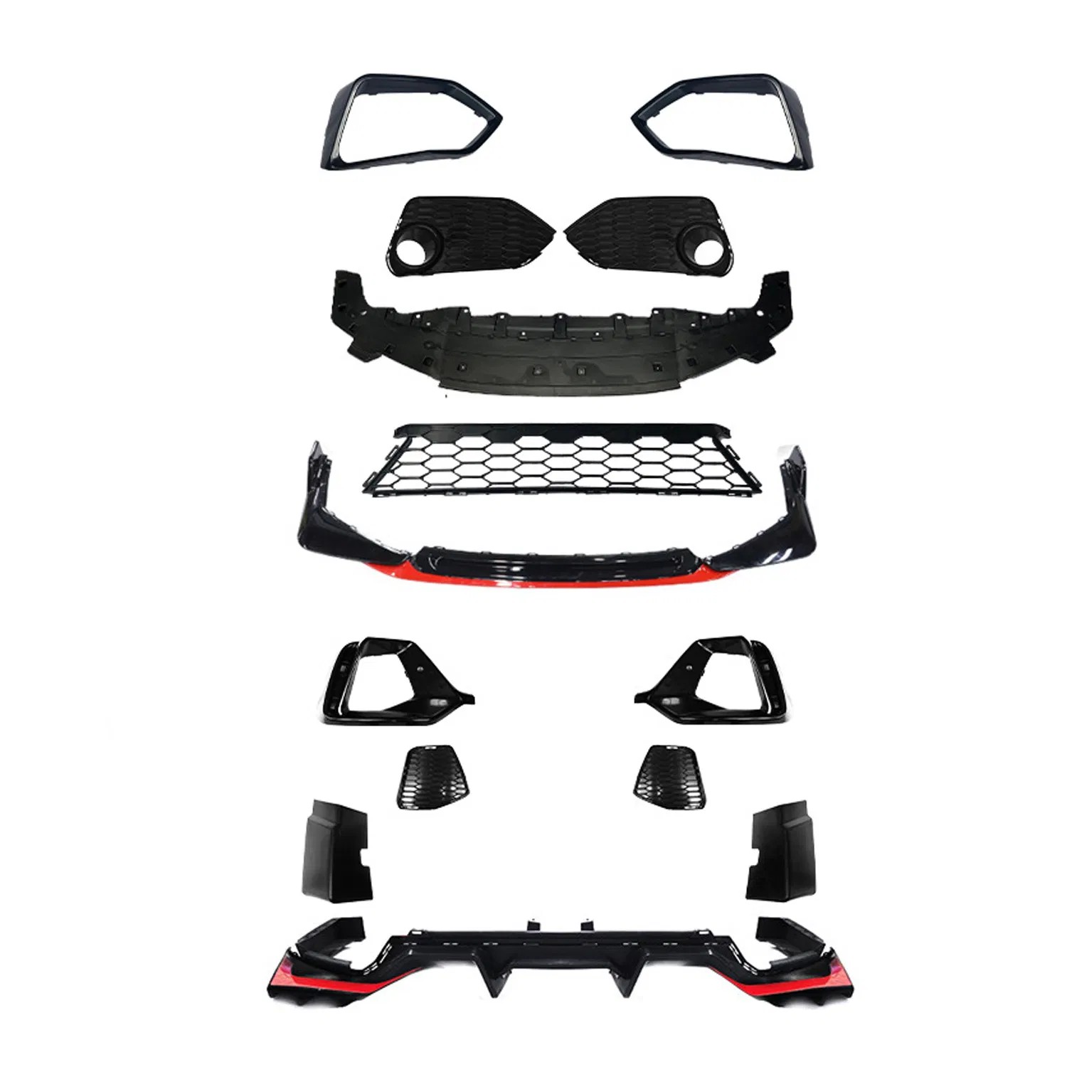 Includes front bumper, rear bumper, side skirts, grille, and spoiler