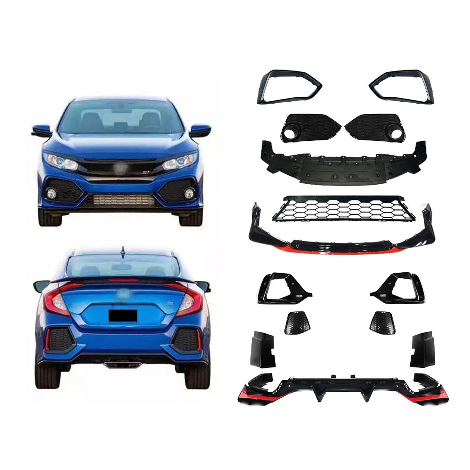 Enhance the appearance and performance of your 2016-2019 Honda Civic 10th Generation with this Complete Body Kit, which includes a front bumper, rear bumper, grille, side skirts, and a spoiler. Designed specifically for the Honda Civic, this kit will dramatically improve the car's overall aesthetic, giving it a more aggressive and dynamic stance. Made from high-quality materials, this body kit is durable, lightweight, and built to withstand daily wear and tear, making it an ideal choice for Civic enthusiasts.